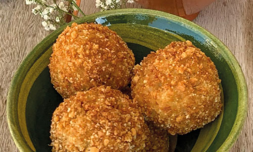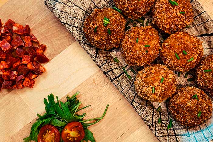 Croqueta de arroz rellena de chorizo y queso emmental.